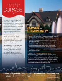 For over 25 years, the DuPage Convention & Visitors Bureau (CVB) has been the only destination marketing organization certifi ed by the State of Illinois to represent the multi-billion dollar travel and tourism industry, which is a key economic development driver, in DuPage County.
