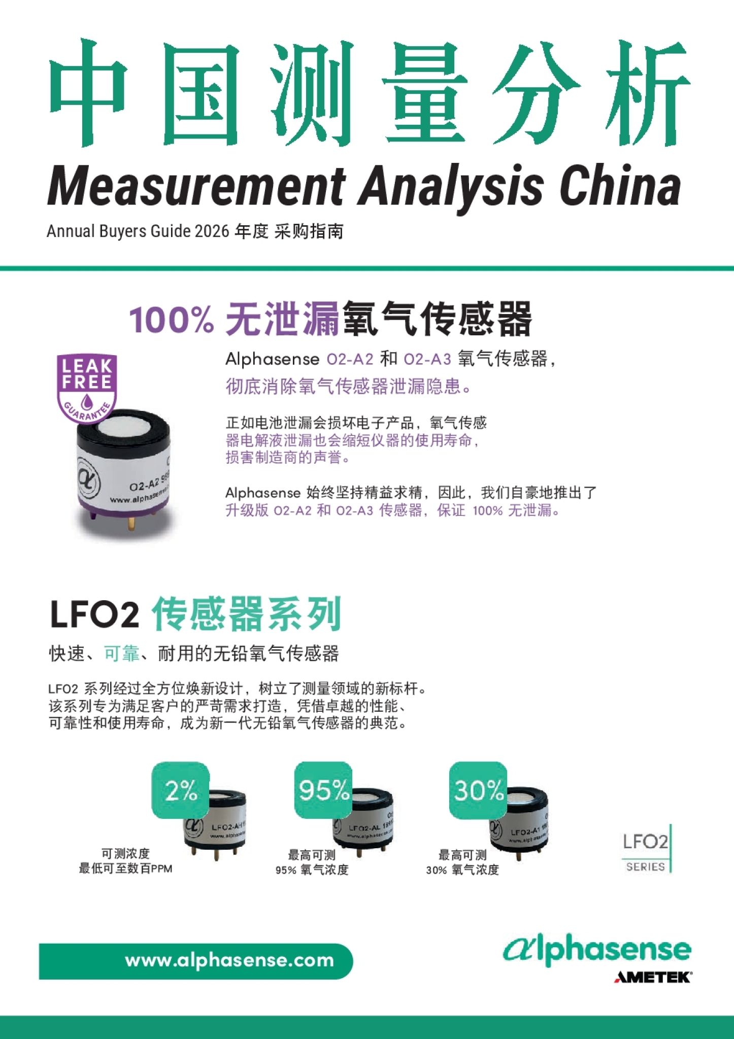 100% 无泄漏氧气传感器 Alphasense O2-A2 和 O2-A3 氧气传感器, 彻底消除氧气传感器泄漏隐患。