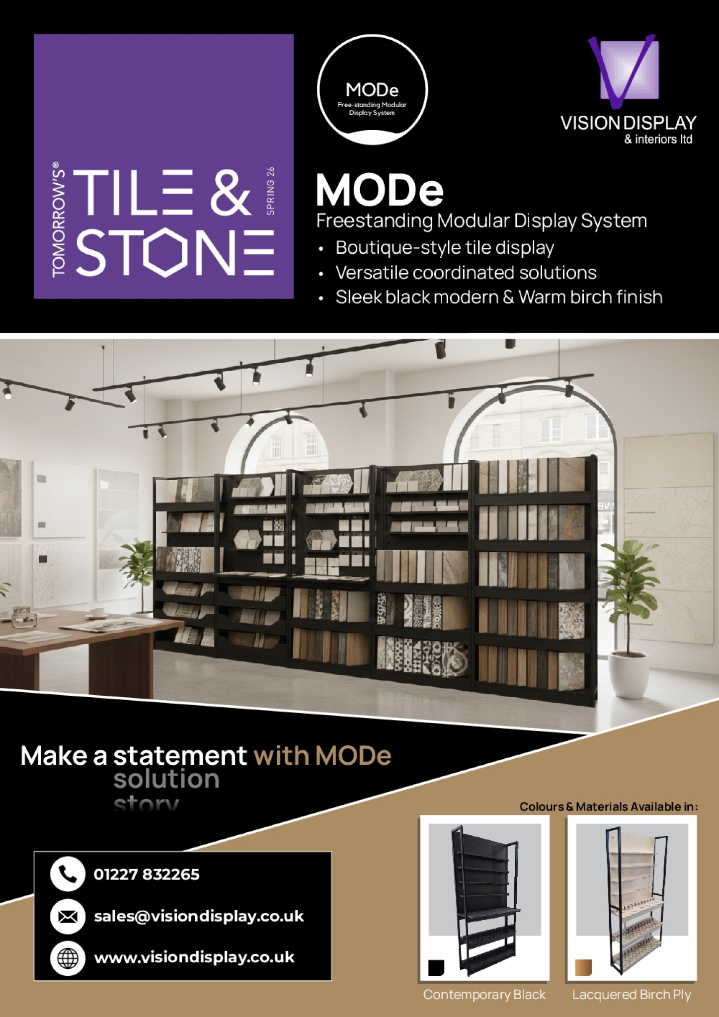 Ÿ Boutique-style tile display Ÿ Sleek black modern & Warm birch finish