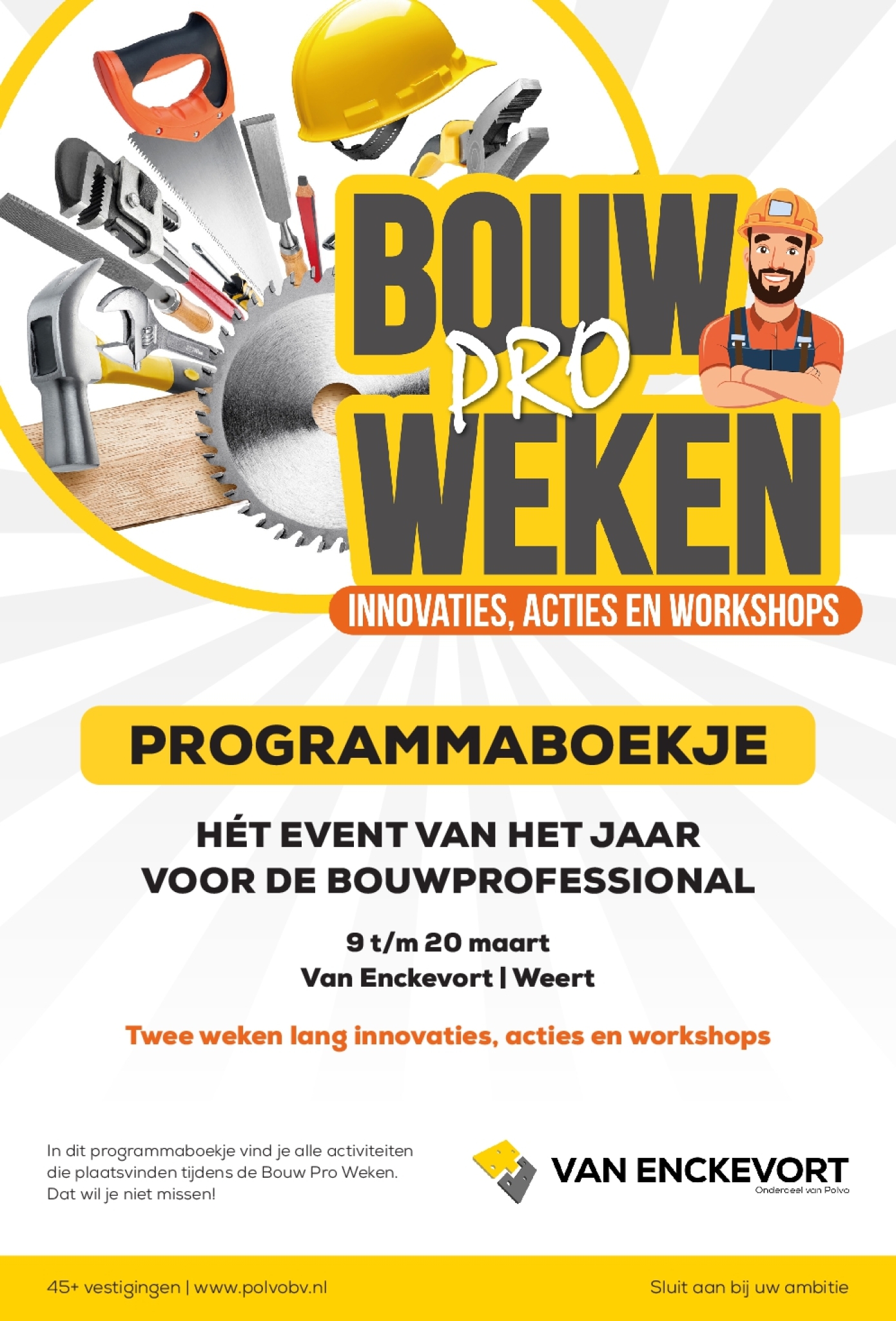 In dit programmaboekje vind je alle activiteiten die plaatsvinden tijdens de Bouw Pro Weken. Dat wil je niet missen!