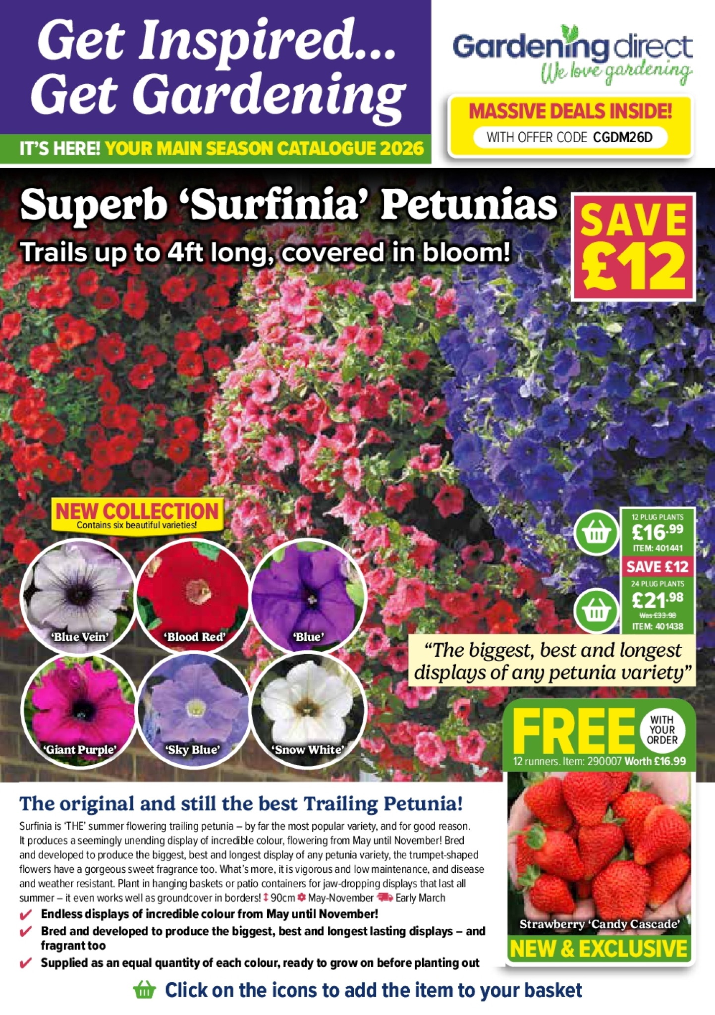 ‘Giant Purple’ ‘Sky Blue’ ‘Snow White’ The original and still the best Trailing Petunia!